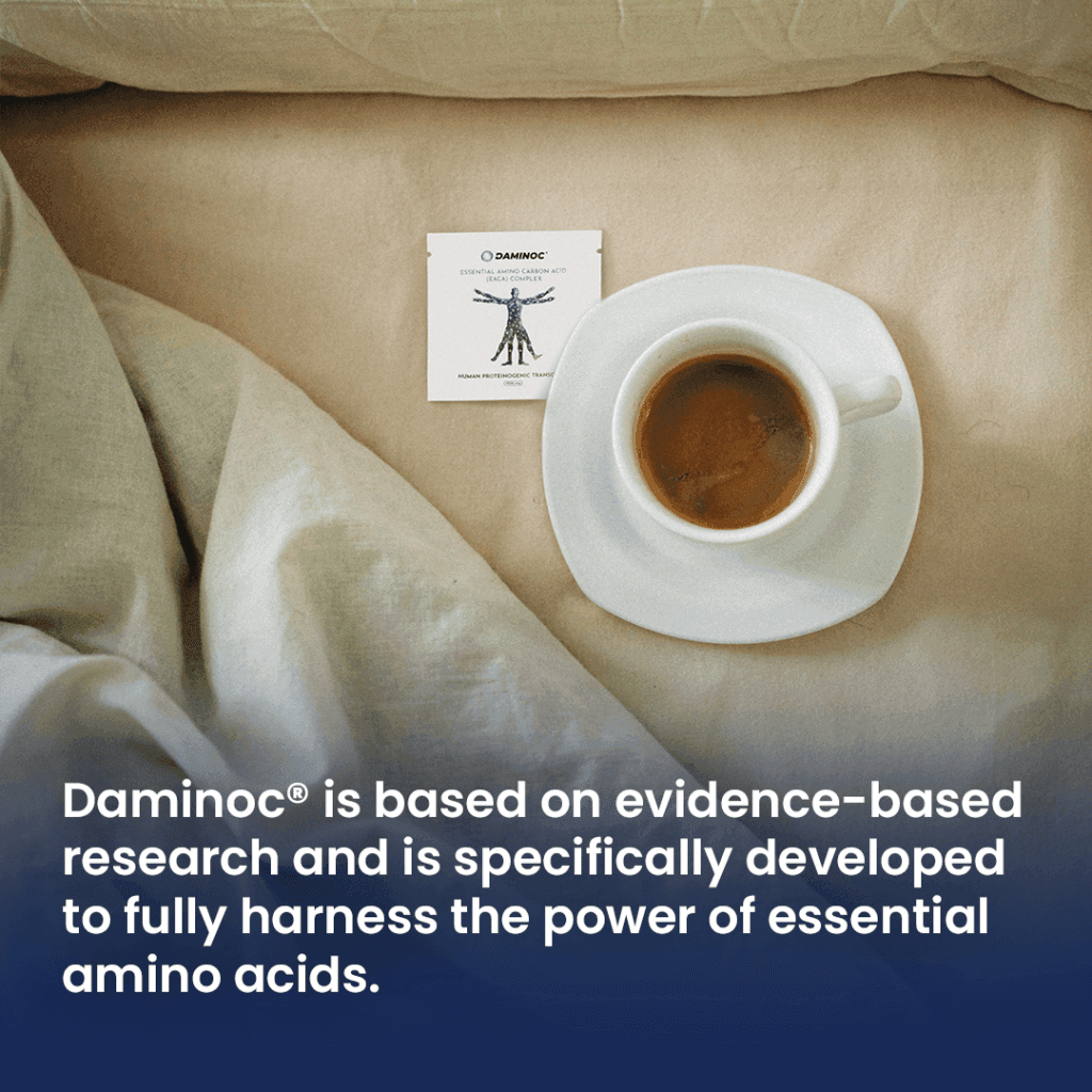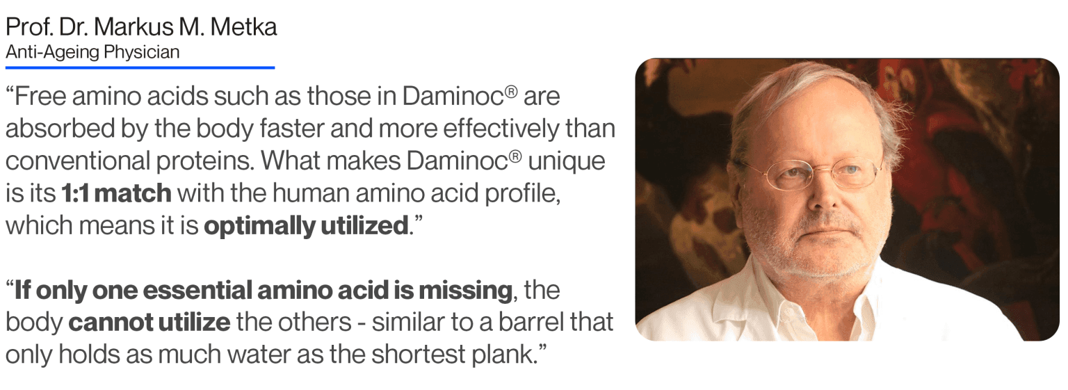 - Perfect ratio: Daminoc provides all the essential amino acids in the exact composition required by the human body. Conventional proteins often contain an imbalance of amino acids – some are present in excess while others are missing.