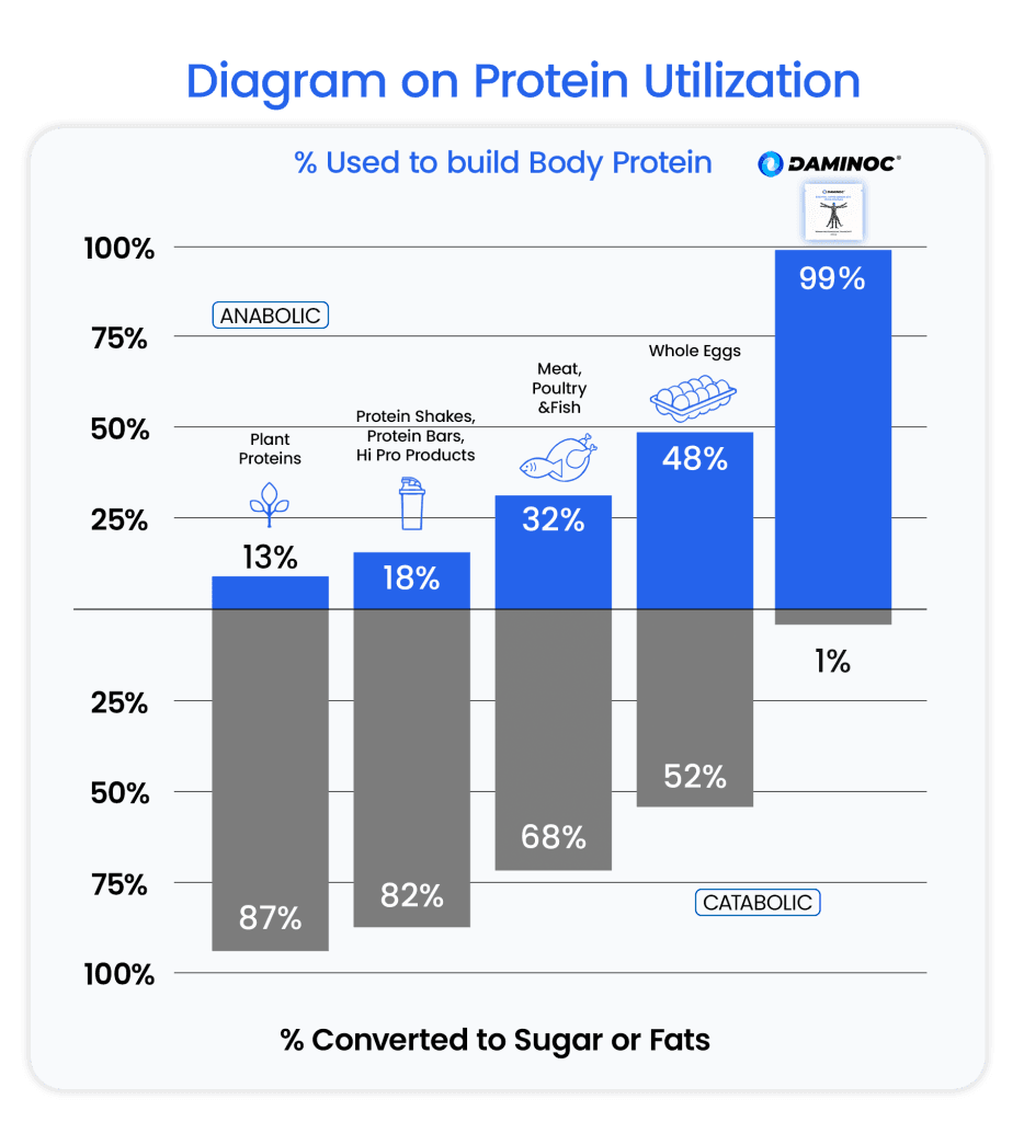 - Minimal nitrogen waste: While conventional proteins produce large amounts of excess nitrogen, Daminoc converts almost all the nitrogen into the body’s own proteins.